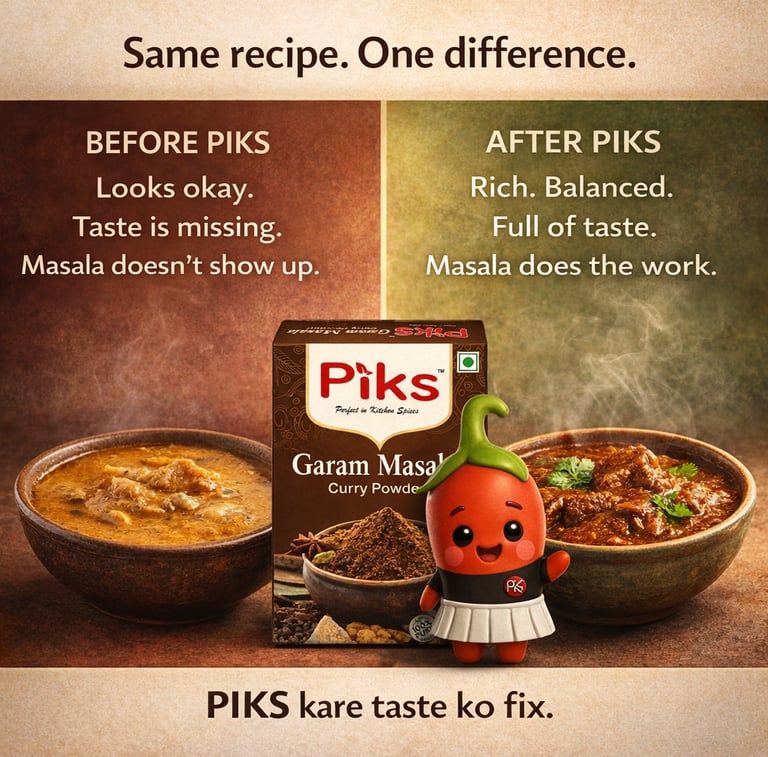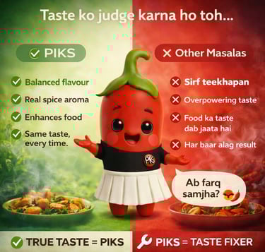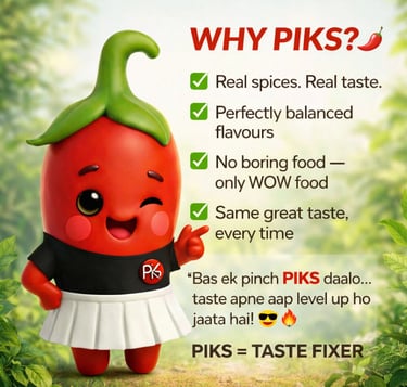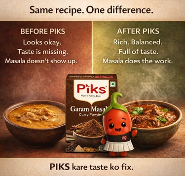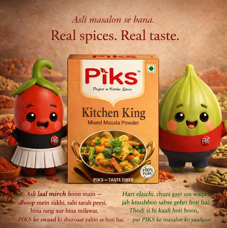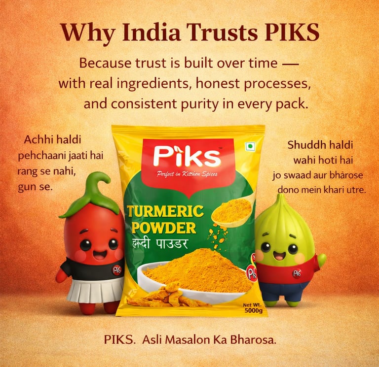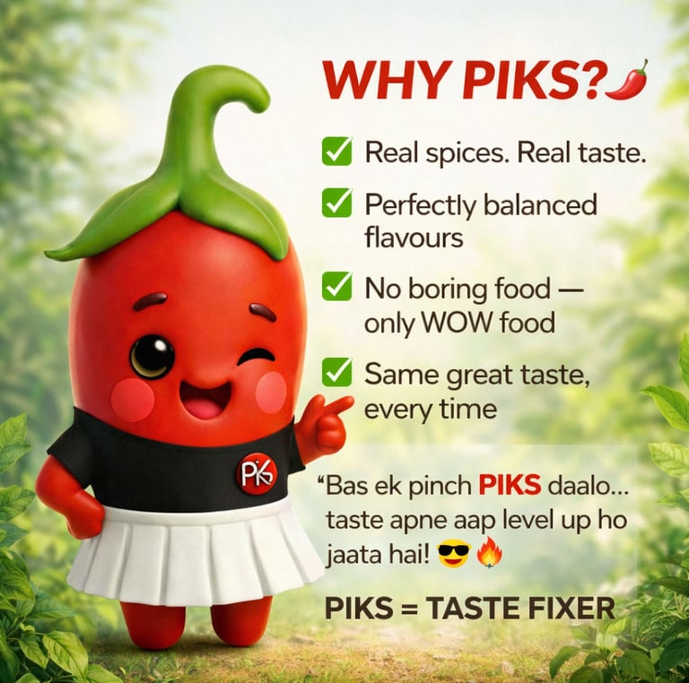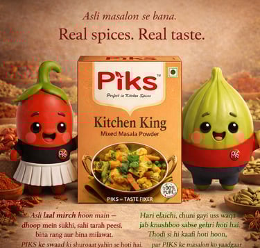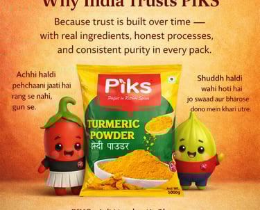 PIKS is one of India's most trusted spice brands, built on a steadfast commitment to quality, authenticity, and consistency. We directly source spices from the best regions, such as turmeric from Selam and cumin from Gujarat, ensuring purity and freedom from additives through strict quality control. PIKS is dedicated to preserving the natural taste and aroma across its wide range of whole, ground, and blended masalas, offering reliable, authentic flavor for every Indian home. Additionally, we support ethical sourcing and sustainable practices, making PIKS a brand that stands for tradition, taste, and quality you can count on.