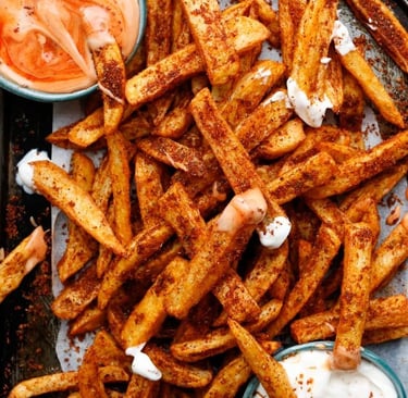 In a large bowl, toss fries with olive oil, PIKS Red Chilli Powder, Black Pepper, Garlic Powder, Paprika, Oregano, Cumin Powder, salt, and cornflour ๐ถ๏ธ๐ฅ. Mix well so each fry is evenly coated.
