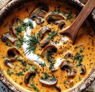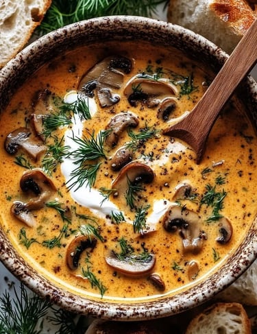 ๐๐ฅฃ โCreamy Hungarian Mushroom Soup โ buttery mushrooms, aromatic paprika, and velvety cream simmered into the ultimate cozy comfort bowl.โ โจ๐