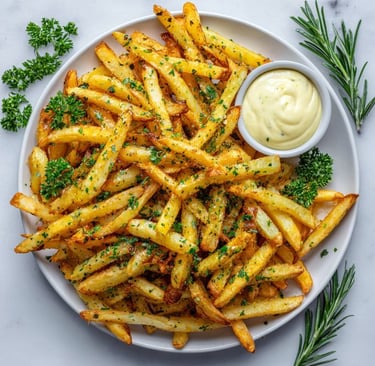 ๐๐ง Crispy Garlic Herb French Fries with Creamy Aioli โ Golden, Crunchy Fries Tossed in Aromatic Herbs and Served with a Rich, Flavorful Dip โจ๐ฅฃ