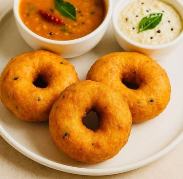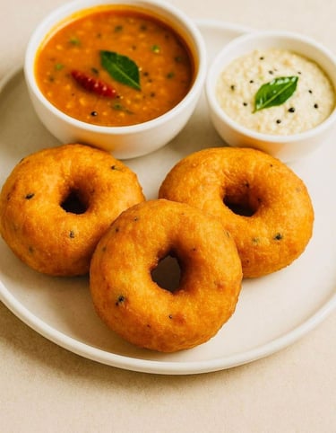 Crispy golden vadas served with soulful sambar and creamy coconut chutney โจ