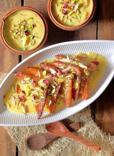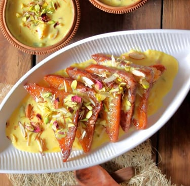 A royal Mughlai dessert layered with crisp bread, fragrant syrup & creamy rabdi โจ